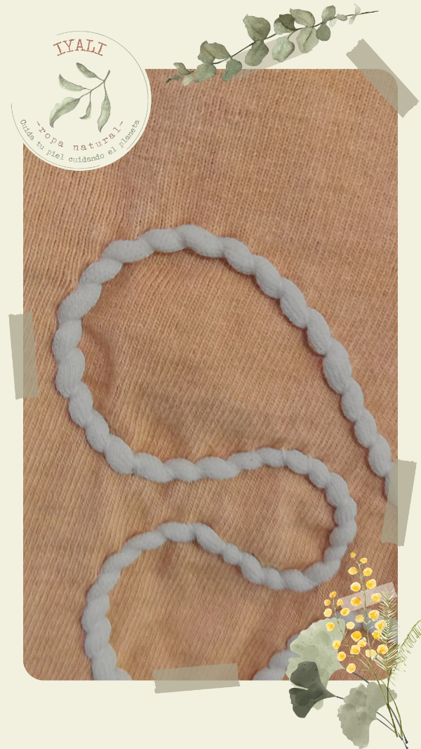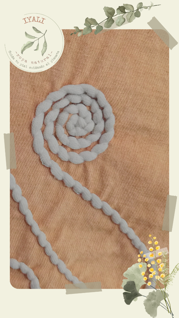 A esta prenda la realicé de forma totalmente artesanal. Mi trabajo va desde el trazado de la moldería hasta el estampado y confección. La trabajé cuidando cada paso, buscando hacer una prenda con responsabilidad. Es un producto sano, ideal para estar en contacto con la piel ya que durante el hilado y tejido no se usaron químicos industriales y menos aún durante el teñido porque solo usé elementos naturales, nada que pueda perjudicarla.