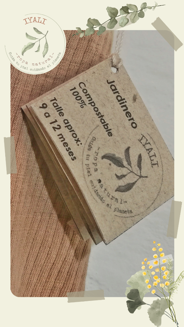 Al estar cosida con hilo de algodón (no de poliester, que es el que se usa comunmente en la confección) y hacerle botónes de madera, este jardinero puede ser compostado cuando haya llegado al final de su vida útil ya que todo lo que lo compone se vuelve tierra.